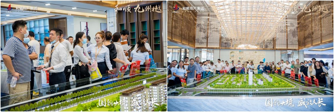 九州樾项目营销团队通过展点拓客、地毯式周密铺排乡镇巡演、微信抖音短视频等强势预热宣传,开放当天,现场人潮涌动、气氛热烈。售楼部内部大气考究,展现了和顺国企实力和产品风格定位,所有人置身于新中式园林建筑中,心中充满对九州樾的开发建设的期待。