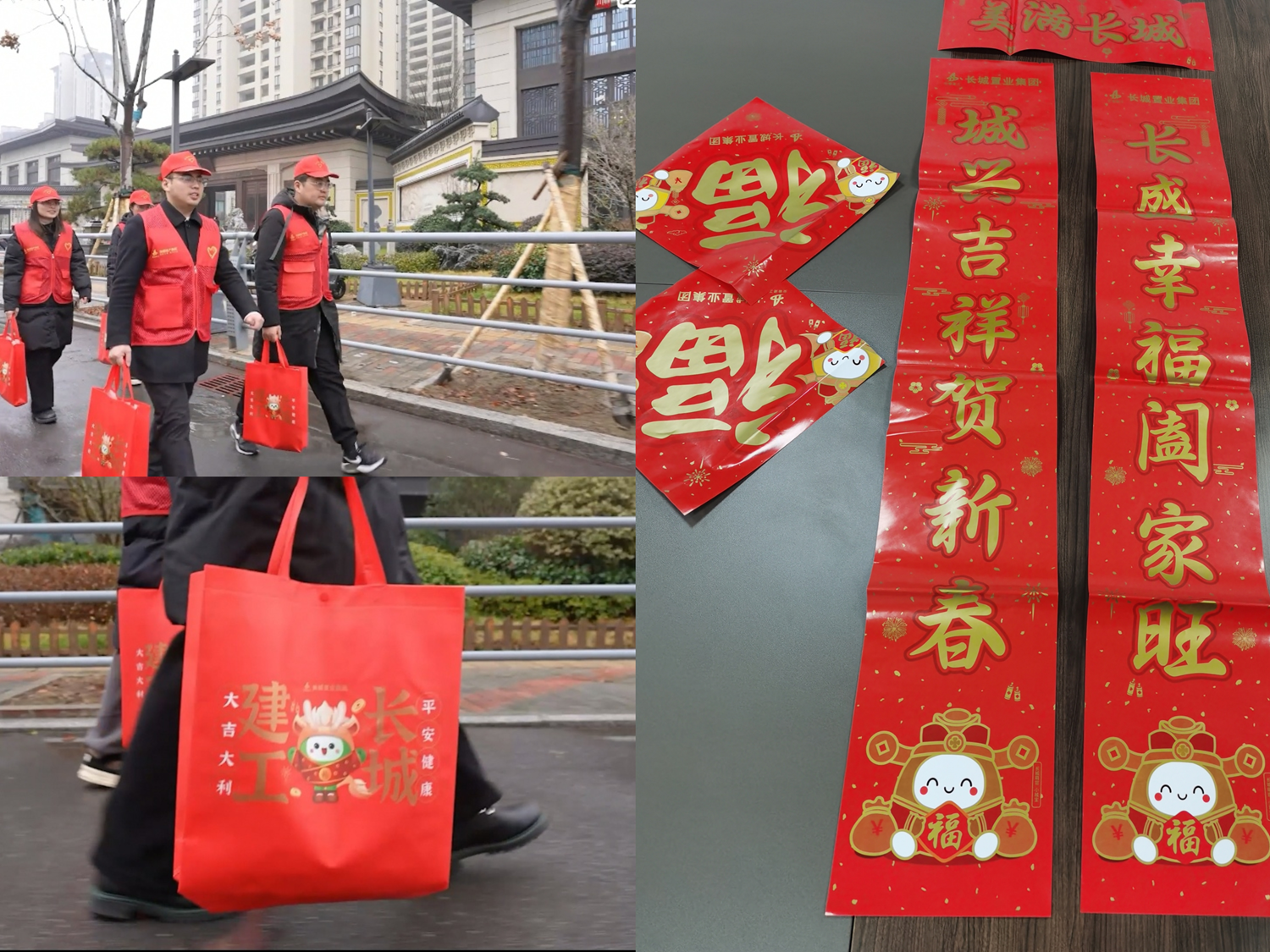 春联寄予着人们对新年生活的美好期盼,在春节来临前,公司志愿者们为过年无法回家的小区业主上门贴春联,为他们送上长城置业专属新年祝福:“长盛幸福阖家旺,城兴吉祥贺新春!”让“美好长城”的暖心祝福陪伴新年还在外坚守工作岗位的业主平安过节。