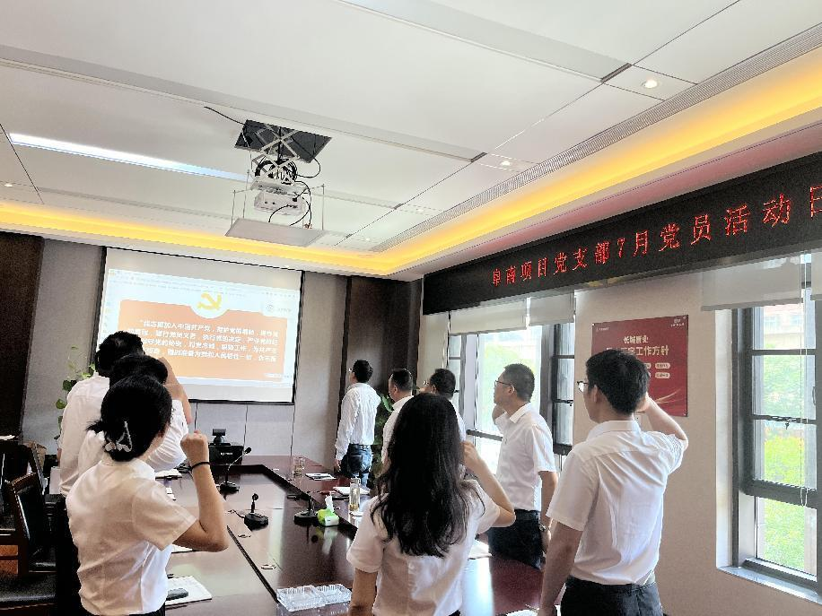 阜南项目党支部组织全体党员及发展对象开展庆祝建党103周年的主题党日活动,重温入党誓词,强化党员意识。面对鲜红的党旗,全体党员庄重地进行了入党宣誓,共同重温入党誓词。这庄严神圣的誓词,深深地触动了在场的每一位党员,进一步坚定了他们为共产主义事业奋斗终身的理想信念和决心。