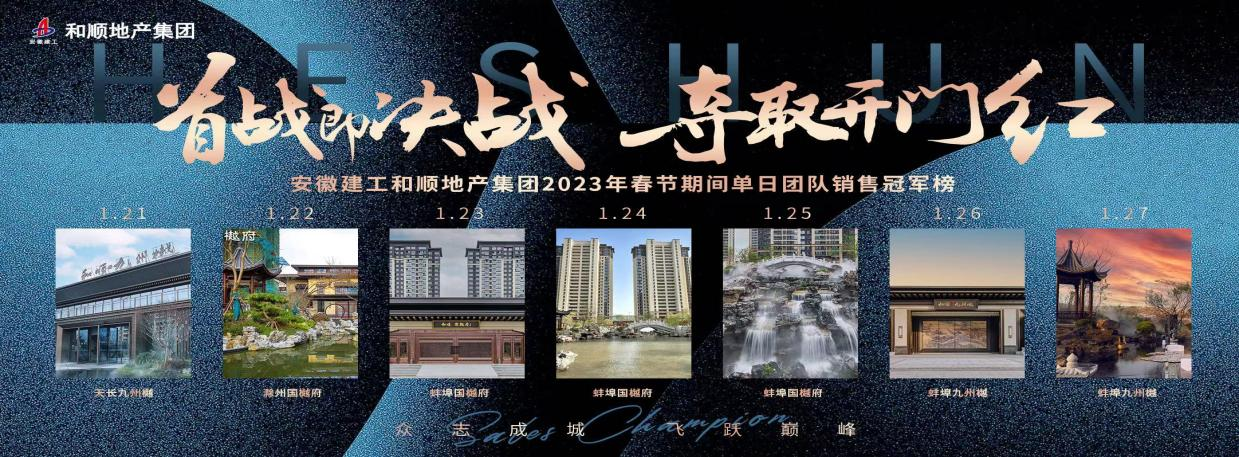 九州樾团队节前启动前期意向客户解筹工作,第一时间梳理意向客户,大年三十全员在岗,通过现场氛围包装、年俗活动,全力约访意向客户到访。滁州和顺国樾府及九州樾团队通力合作、勠力同心,以更加昂扬的奋斗姿态和更饱满的精神风貌投入工作中,喜报频传:2023年和顺地产春节期间单日个人销售冠军榜7位冠军强势占位3席、团队销售冠军占位2席,初七开工首日销冠依然花落滁州,真正实现“首战即决战 夺取开门红”!